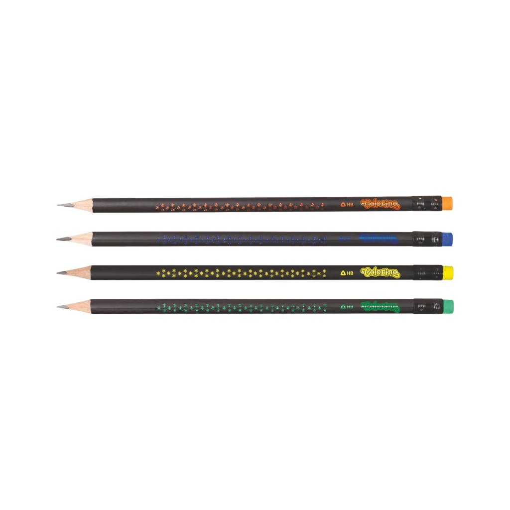 Trojhranná grafitová ceruzka tvrdosti HB s metalickým motívom hviezd. Mäkká guma umožňuje ľahké odstránenie kresby bez poškodenia papiera. Tuha lepená po celej dĺžke je odolnejšia proti polámaniu.