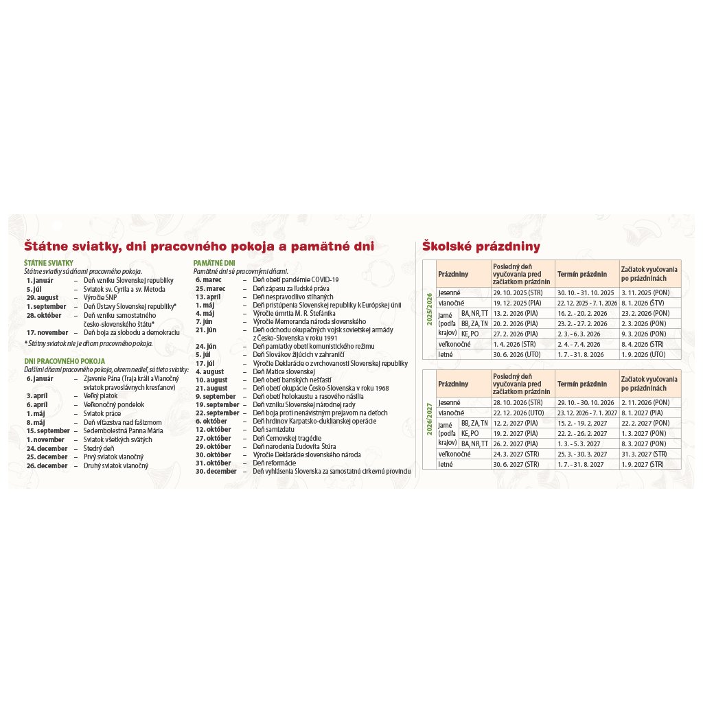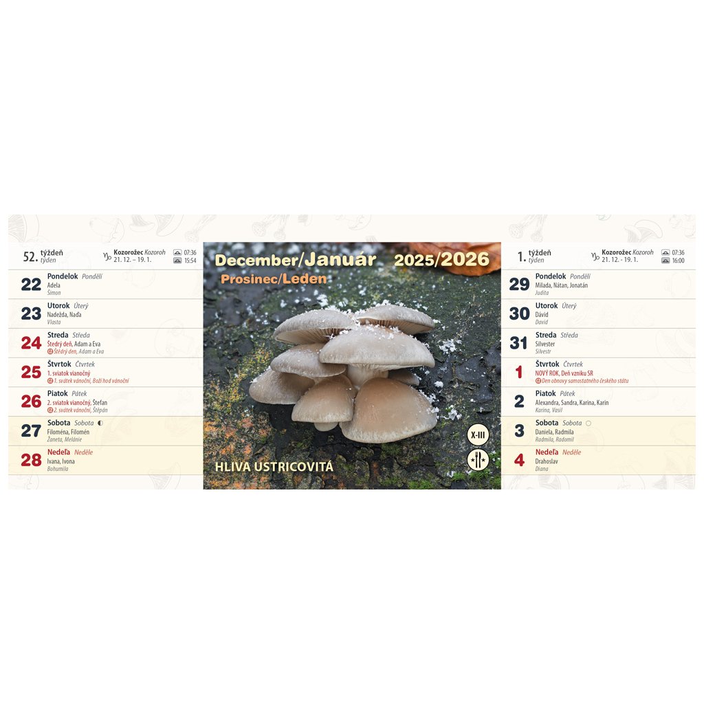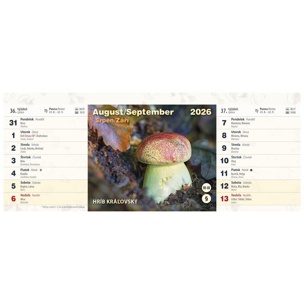 Úžasný hubársky dvojtýždňový stolový kalendár vám predstaví krásne hubárske úlovky zo slovenských lesov a lúk aj s názvom huby, piktogramom – jedlá, nejedlá, jedovatá huba a časom ich výskytu. Nájdete v ňom informácie o východe, západe Slnka, znamenia zverokruhu, slovenské a české mená a štátne sviatky oboch krajín. A nezabudnite, pri zbere húb sa poraďte so skúseným hubárom. Nezbierajte huby, ktoré nepoznáte.