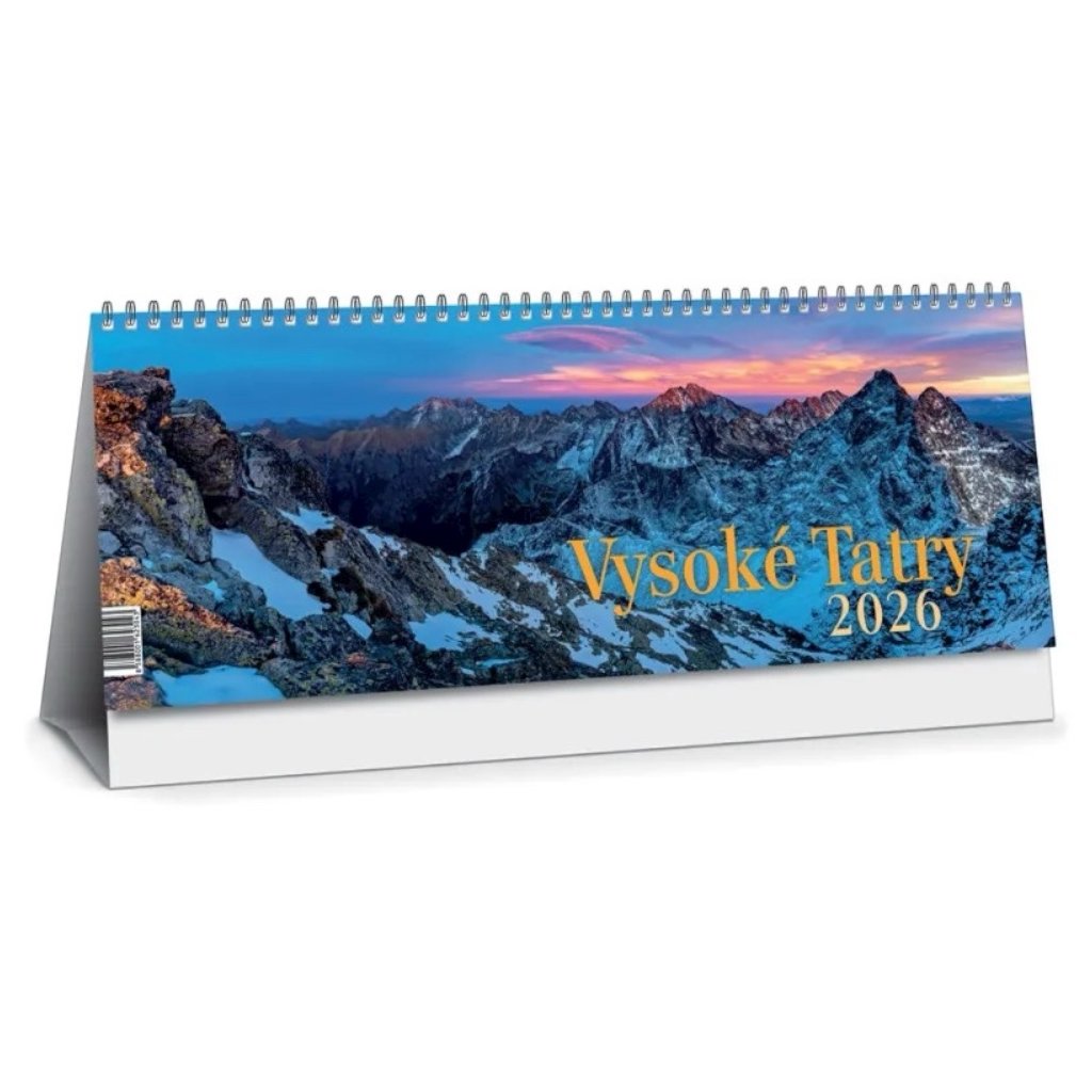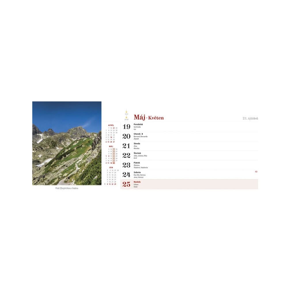 Tatranské štíty, príroda a ľudia, zachytené v stolovom týždňovom kalendári s riadkovým delením, daňovými pripomienkami, fázami Mesiaca, východmi a západmi Slnka, štátnymi sviatkami všetkých krajín EÚ, školskými prázdninami, slovenskými a českými menami (plus netradičné mená).