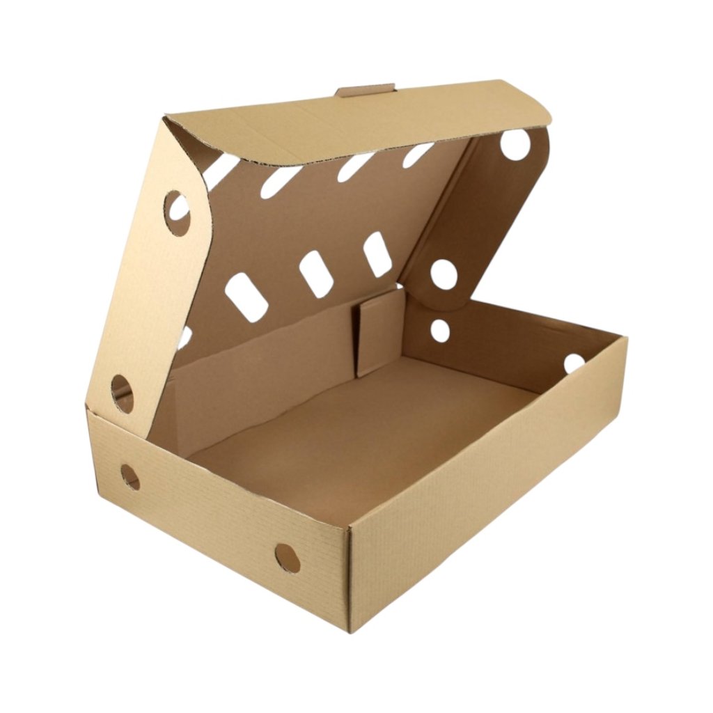 Kartónové krabice s klopovým vekom a vetracími otvormi z trojvrstvovej vlnitej lepenky patria v súčasnosti k najpoužívanejším obalom. Tento obal je ekologický a plne recyklovaný. Sú vhodné na skladovanie a taktiež prepravu najrôznejších materiálov a tovarov, hlavne sa hodia pre mäsiarský a potravinársky priemysel na uskladnenie mrazeného mäsa. Krabica s klopovým vekom je typ konštrukcie ktorá zvyšuje celkovú pevnosť krabíc a pomáha chrániť zabalený tovar pred otrasmi a inými vonkajšími vplyvmi, má po bokoch a na veku vetracie otvory pre cirkuláciu vzduchu. Krabice v rozloženej forme sa ľahko skladujú. Manipulácia s krabicami je veľmi jednoduchá a zložiť ju zvládne naozaj každý.