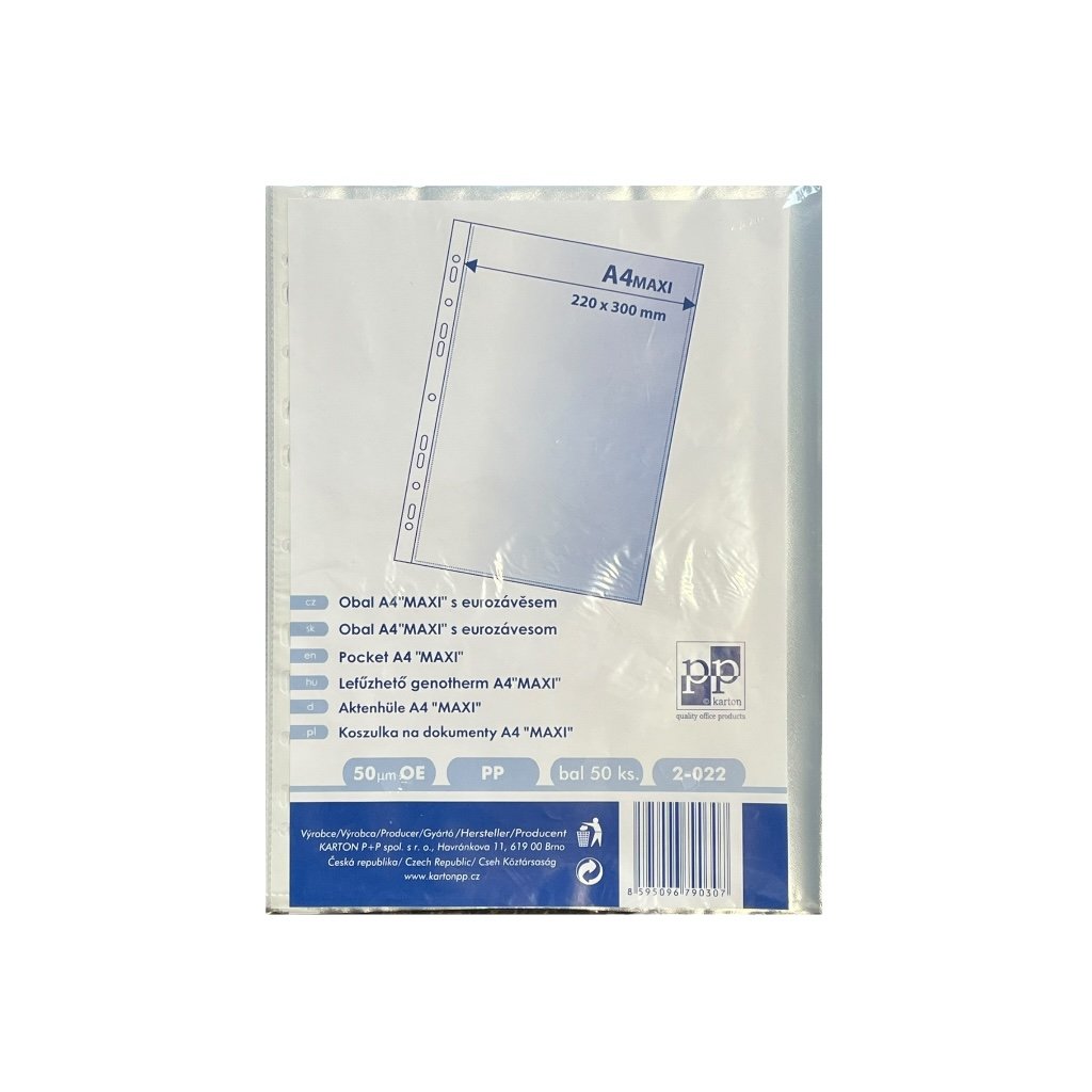 Obaly s eurodierovaním vhodné na zakladanie materiálov rozšíreného formátu A4. Povrch matný. Otvor zhora. Vnútorné rozmery obalu 300 × 220 mm. Balené v sáčku. Hrúbka 50 mic. Balenie 50 ks