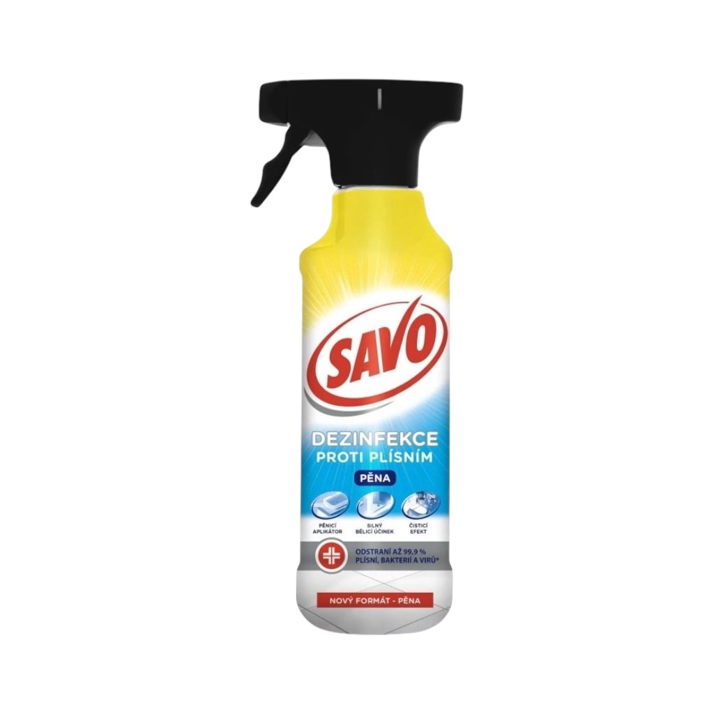 Zbavte sa nepríjemnej plesne na omietkach, oteruvzdorných maľbách a iných umývateľných plochách už raz a navždy. S efektívnym a rýchlym odstránením vám pomôže dezinfekcia SAVO proti plesni, ktorá najnovšie pri aplikácii vytvára aktívnu penu. Počas použitia tak nebude dochádzať k nechcenému zasiahnutiu okolitých plôch a taktiež sa nebude vytvárať dráždivý aerosól. Pena tiež lepšie priľne na zvislých plochách a horšie dostupných miestach, kde bude na ošetrenom povrchu dlhšie držať a predĺži sa tak doba účinnosti dezinfekcie. Čistiaca pena SAVO proti plesni zlikviduje 99,9 % baktérií, plesní a vírusov, vrátane obalených. Má tiež veľmi silný bieliaci účinok.