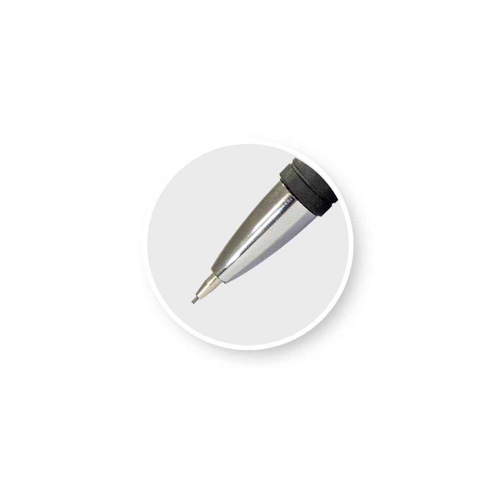 Elegantná mikroceruzka s gumou a gumovým drážkovaným gripom na pohodlné držanie a písanie. Praktická ochrana v podobe zasúvacieho hrotu zaisťuje mikroceruzke dlhú životnosť. Transparentné telo v kombinácii dvojfarebného dizajnu modrej a čiernej s kovovými doplnkami. Tlačené logo na tele.